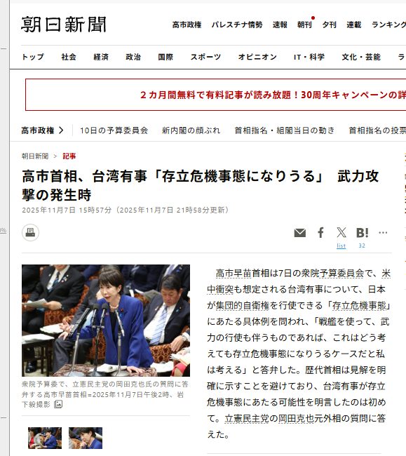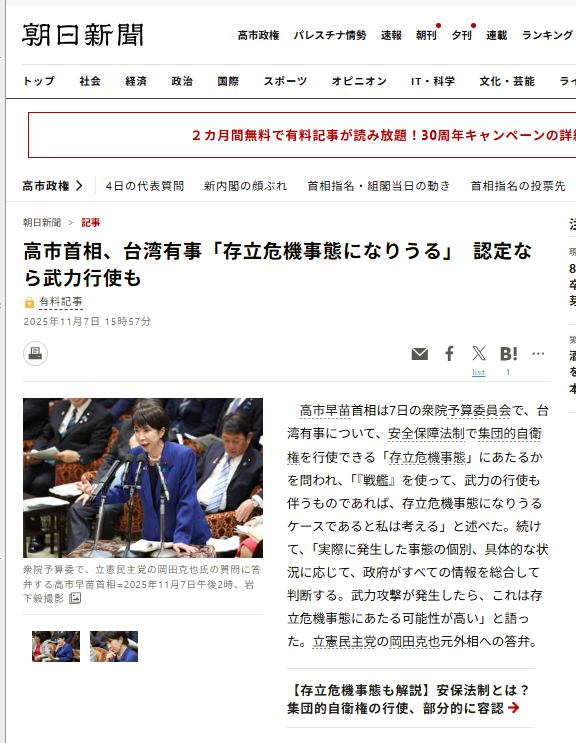 | ウヒ〜大々長投稿になっちゃった! 偏執ジジイのイライラ書だと思って大目に見て! m(_ _)m -----------------今NETで燃えている記事の一つ-------------------- 中国 薛剣大阪領事の高市首相への「首を切る」Xでの発言の日本の反応に対して中国が興奮 反応して激しく日本攻撃を始めているが, そもそも 薛剣領事が基地外みたいに暴言を吐いたの は、下の朝日新聞のNET記事を見たからともっぱらの評判! きっかけは予算委員会での◆立憲岡田委員の首相への台湾問題への日本の対峙姿勢への質問 から始まった混乱ではあるが, これに朝日新聞が 何時もの煽り記事を書いて挑発したんだな〜 どうして 左翼マスコミは、特に 朝日新聞は日本の国益に反する、特に反日国を利する記事 ばっかり書くのかな〜 あのね、◆戦前の朝日は軍部擁護記事ばかり書いて戦争に突入させた 前歴があるんだが→現在は何と真逆, 反日国の軍部の応援記事ばっかり書いてるんだもんな〜 ---------------------------------------------------------- ◆今回の日中関係悪化が「朝日新聞の誤報が原因ではないか?」 と話題になっている模様、過去の記事を魚拓で確認してみたところ…… ↑薛剣領事が朝日に刺激されて出した]投稿 ↑改定された朝日記事を見て出た]投稿 ↓↓それぞれ、 ↑↑ に対応した実際の朝日新聞NET記事 ↑画像、それぞれ 読みづらいので 文字起こし してみた ↓ ↓ 高市首相 台湾有事「存立危機事態になりうる」認定なら武力行使も👈 2025年11月7日 11時57分 高市早苗首相は7日の衆議院予算委員会で、台湾有事に ついて、安全保障法制で集団的自衛 権を行使できる 「存立危機事業」にあたるかを問われ, 「「戦艦を使っ て武力の行使も伴う のであれば、存立危機事業になりう るケースであると私は考える」と述べた。 続けて、 「実際に発生した事態の個別、具体的な状況に 応じて、政府がすべての情報を総合して判断 する。武力 行使が発生したら、これは存立危機事態にあたる可能性 が高い」と言った。 立憲民主党の岡田克也元首相への答弁 ↑の赤字の文は↓の訂正記事では抜いてある。 ---------------------------------------------------- 高市首相 台湾有事「存立危機事態になりうる」武力行使の発生時 👈コレを変えた 2025年11月7日 17時57分(2025年11月7日 21時58分 更新) 高市早苗首相は7日の衆議院予算委員会で、米 中衝突も想定される台湾有事について, 日本 が 集団的自衛権を行使できる「存立危機事業」 にあたる具体例を問われ, 「戦艦を使って, 武 力 の行使も伴うものであれば, これはどう考 えても存立危機事業になりうるケースであると私は 考える」と答弁した。 歴代首相は 見解を明確に示す事を避けており 台湾有事が存立危機事態 にあたる可能性を明言したのは初め て。立憲民主党の岡田克也元首相の質問に答 えた。 ---------------------------------------------------- もう一回◆【資料】高市台湾有事発言(書き起こし)を読んでみると、 『中国側が戦艦を使って台湾に武力行使なら日本は「存立危機事態」と認定せざるを得ない』 と言ってるわけで 『中国側が戦艦を使って台湾に武力行使なら日本も「武力行使」する』とは言ってないんだが この辺が左翼マスコミの政府発言要旨をヒン曲げて, 読者を誘導する常套手段なんだがな〜 今回は 中国の領事がコレに釣られて大事になってしまった。中国も「首を切る」発言の処理に 困り、朝日の虚言に騙されたままで、米国との軋轢を避けるため日本に猛攻撃をかけてきた! 立憲岡田克也議員の、高市議員憎しのネチネチした質疑のおかげで日中交易が 大変な目にあっ て来だし、さらに海産物までも禁輸措置になり漁民達もが苦しい立場に置かれだした。 ---------------------------------------------------- いくら左党であっても、敵対国に有利な答弁を誘導するのは国益に反するとの意見が炎上 ◆【ヤフコメで話題】「立憲民主党・岡田克也氏の国会質問に批判」 「高市首相の答弁を巡る議論」 - 立憲民主党の国会対応が話題に ◆いやはや立憲岡田克也批判がNET上でワンサ噴き出した これからの選挙、立憲は伸びるんだろうか? 他人事ながら気になってきたよ! |
