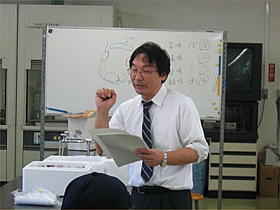 食味の評価には化学的評価法や物理的評価法の他に、人間の感覚器官(目・鼻・舌・手・足・皮膚)を用い五官(視覚・嗅覚・聴覚・味覚・触覚)にもとづいて、物の善し悪しや嗜好などを分析したり判定する官能検査というものがある。まず官能検査の特質や科学的方法について勉強し、具体的に焼酎の官能検査について詳しく解説があった。 その後化学実験室に移動し、味覚テスト(甘味・酸味・塩味・苦味・旨味)を実際に行った。2点比較法による濃度差弁別能力試験や濃度を低くした味覚テストなどを体験し、かなり個人差があることを実感した。 |