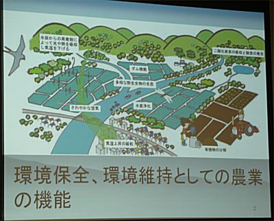 | 農業は食糧生産の面だけではなく環境保全の面からも考えなければならない。 |
