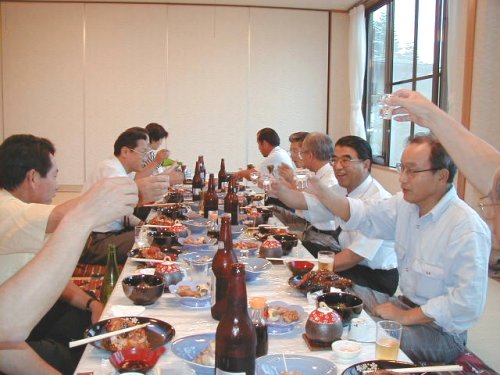 | 西山荘でカンパイ!。料理といい景色といい最高でした。鯉の甘露煮が抜群。 |