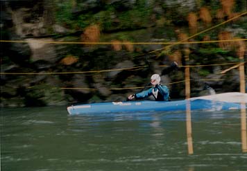 練習用にと冬の間に若い連中がロープを張りゲートを作っている。ロープは工事現場などで使っている一番安いものらしい。黒と黄色の縞々になってるからトラロープと称していた。言い得て妙ではないか。 トラロープに竹のゲート。雨にけぶる墨絵のような情景。そこに赤や青のカヌーを漕ぐ若者。中国四千年の歴史も真っ青である。 |