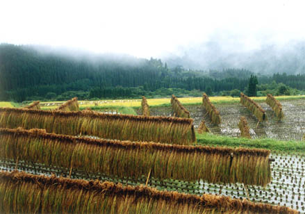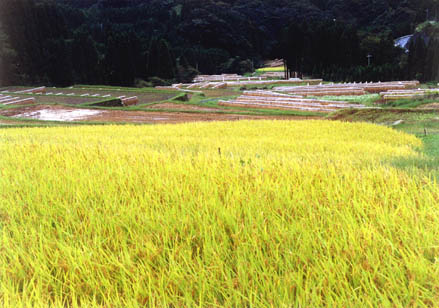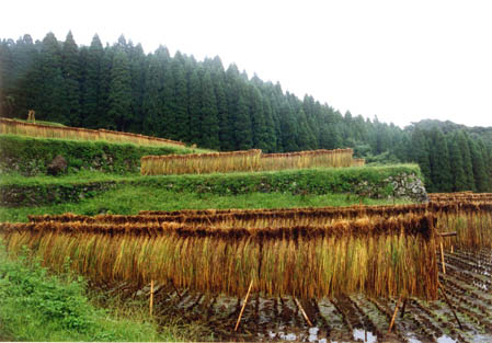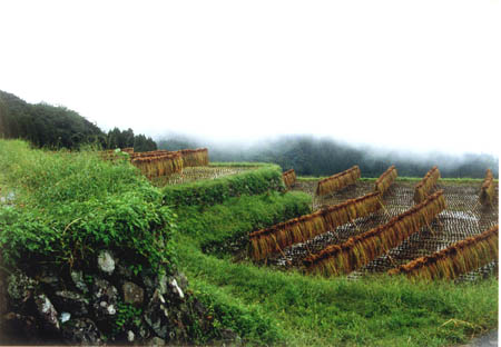 | 上が酒谷の棚田。右が安久の棚田。 ご多分に漏れず減反だとかで棚田が棚畑になってたりもするが、先人の米作りに対する執念みたいなものを感じる。こんな山の中でこつこつと石を積み上げ、営々と稲を育ててきたのに、それを今さら減反してください、なんぞとはもってのほか。きっと、執念が怨念に変わる日が来るぜよ。 |